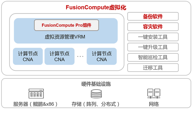 Composed of VRM (Virtual Resource Management) and CNA (Computing Node Agent), it realizes virtualization of servers, storage and networks, forms an elastic resource pool, and realizes automatic resource scheduling and management.